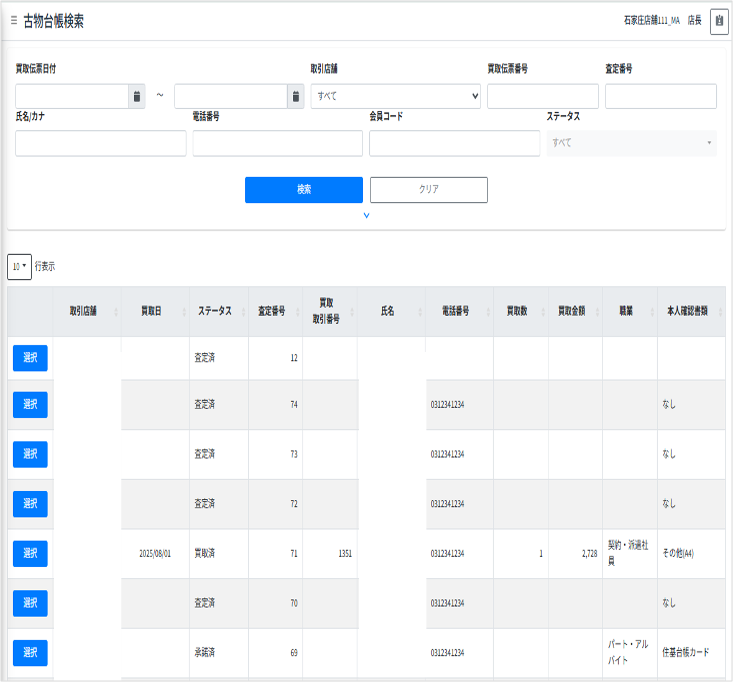 買取伝票・査定履歴を多条件で検索可能