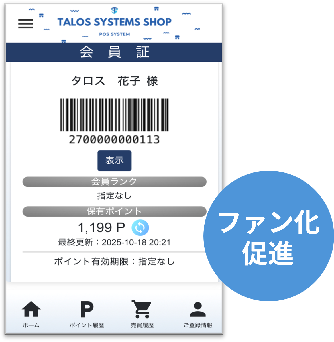 来店回数や購入金額に応じてポイントを付与でき期限設定も可能。